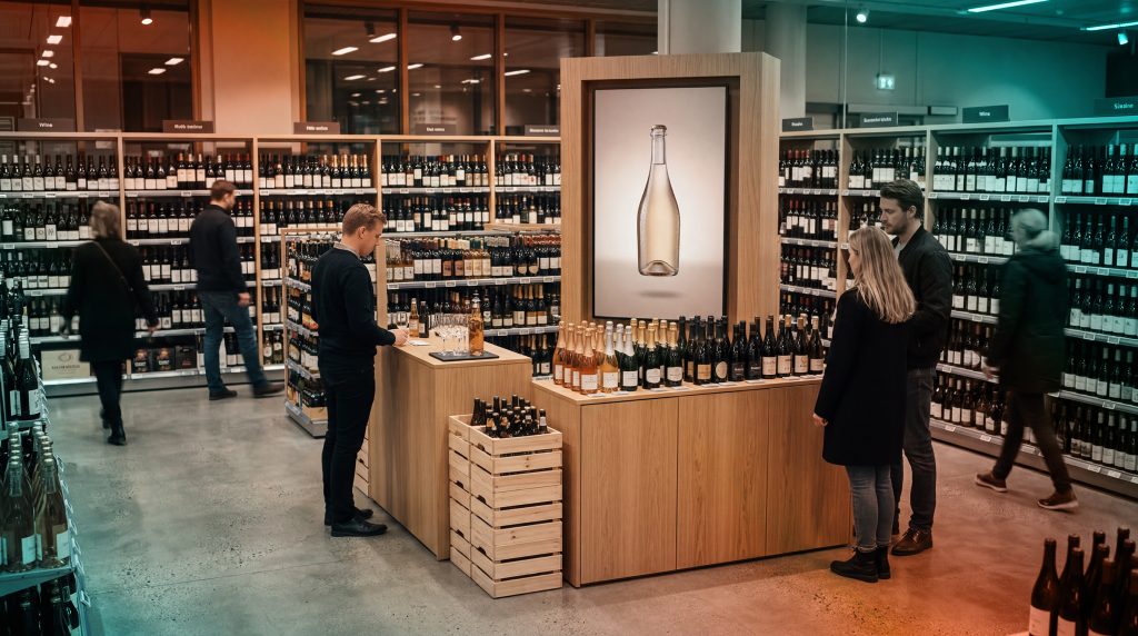 Shelf-edge screens or displays integrated directly into fixtures sit at the closest possible point to the product. These placements influence shoppers at the moment of choice and are tightly connected to the items available on the shelf.